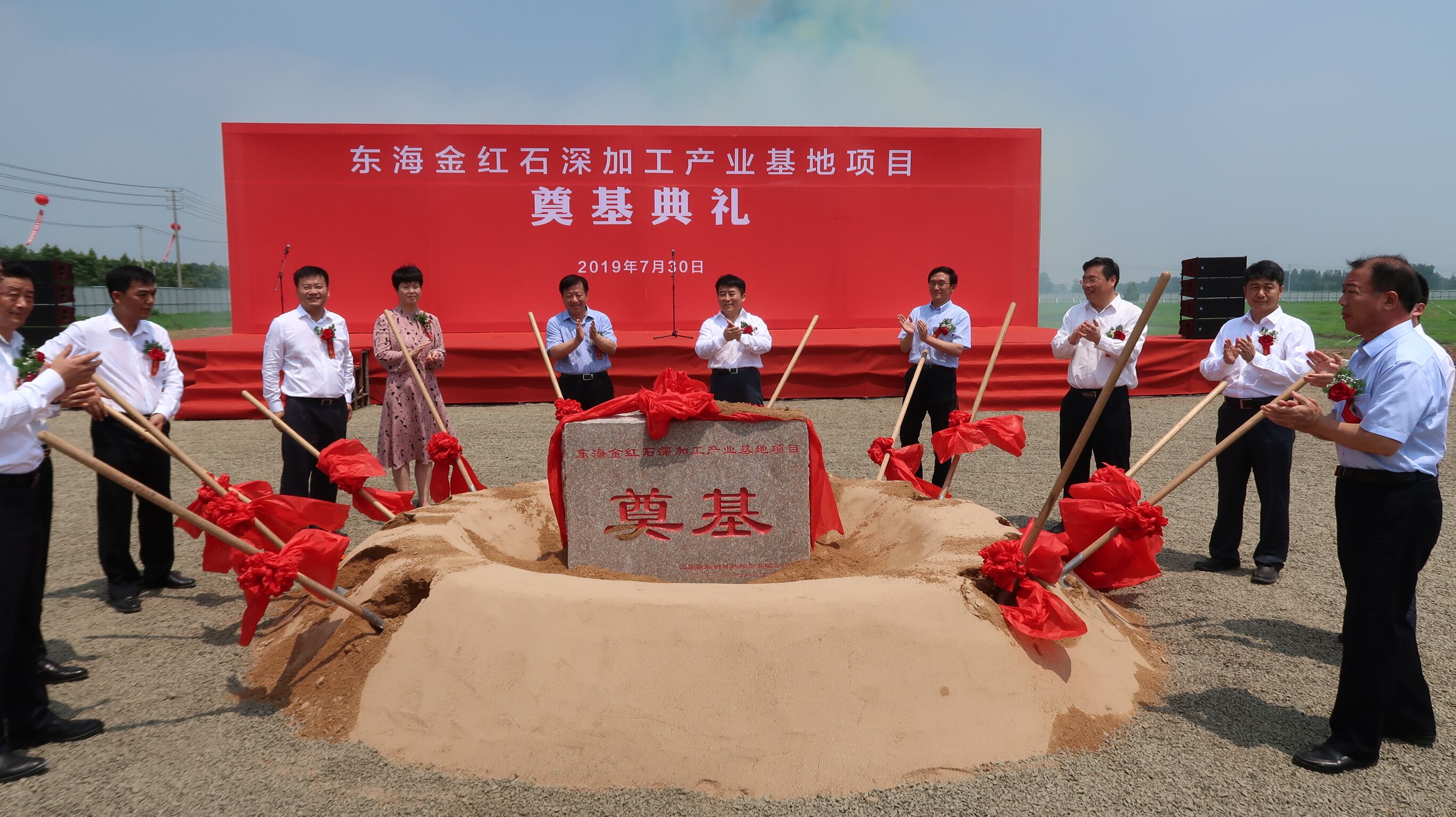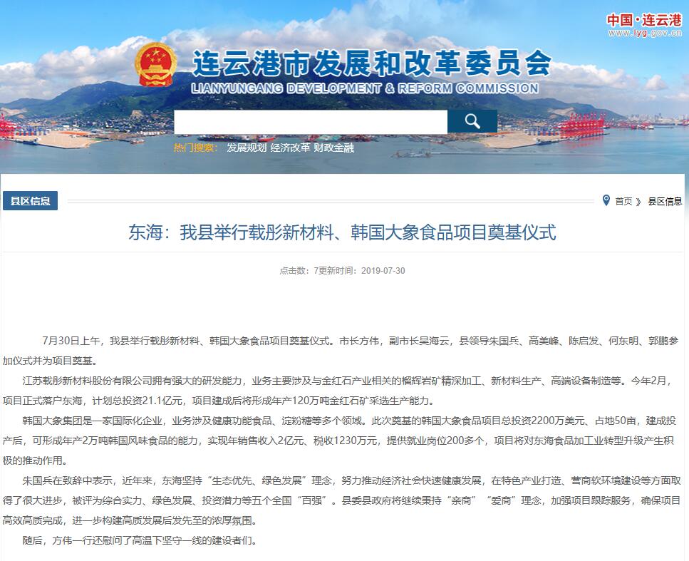 7月30日上午,日照石榴石礦業東海項目—江蘇載彤新材料金紅石深加工項目在東??h舉行開工奠基儀式,連云港市長方偉,副市長吳海云,東海縣領導朱國兵、高美峰、陳啟發、何東明、郭鵬參加儀式并共同為項目培土奠基。載彤新材料金紅石深加工項目作為縣、市重點推進項目受到各方領導和媒體的關注,連云港市發展和改革委員會并對奠基儀式進行了跟蹤報道。